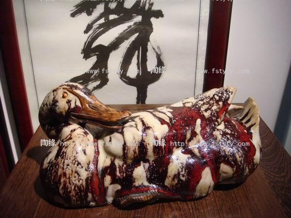 以我的经验,我作过这样的表述:石湾陶塑之中釉的应用,概言之有三大部类。一是透明状的釉,二是乳浊状的釉,三是凝固状的釉,这三大部类的釉。如果你应用到得心应手,就能烧出各种绝妙的变化来,我们啸风堂应用复合釉的方式,是用不同状态的釉经过两种甚或多种的不同的复合,使它们在高温煅烧时互相渗合、演变、流注、加上施釉方法的多种不同的运用,诸如浸、刷、塗掛、点、垛、弹、抹,足可使作品倍为增色,熠熠生辉。